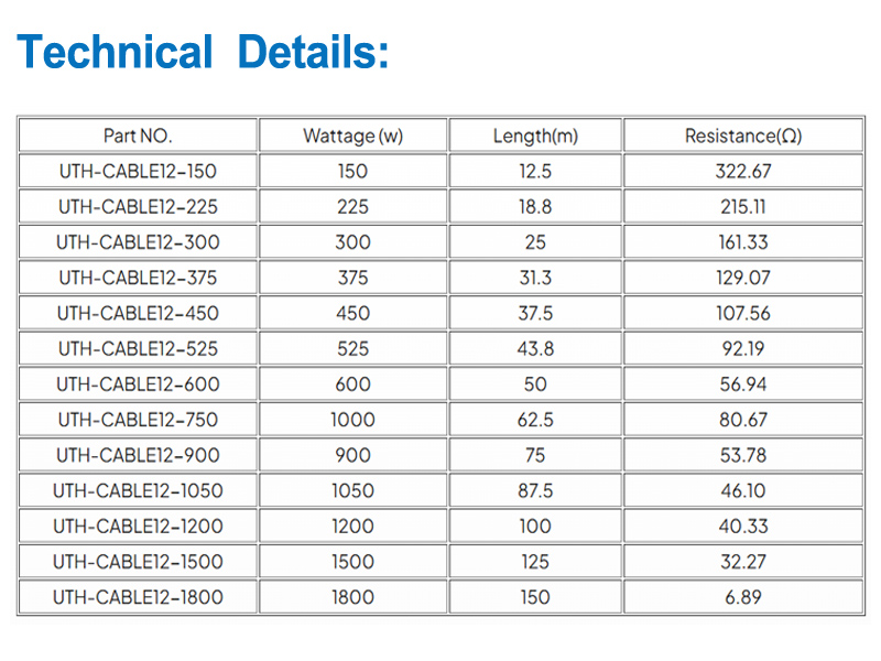+10%/-5%El cable de calefacción por suelo radiante de doble conductor UTH-Cable se puede utilizar para baldosas de cerámica, piedra natural y pisos de madera, etc. También es adecuado para calefacción primaria o secundaria.