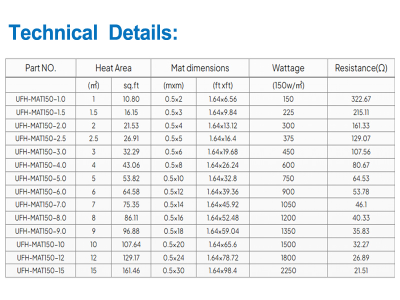 | UFH-MAT150-1.5 | 1.5 | 16.15 | 0,5x3 | 1,64 x 9,84 | 225 | 215.11 |